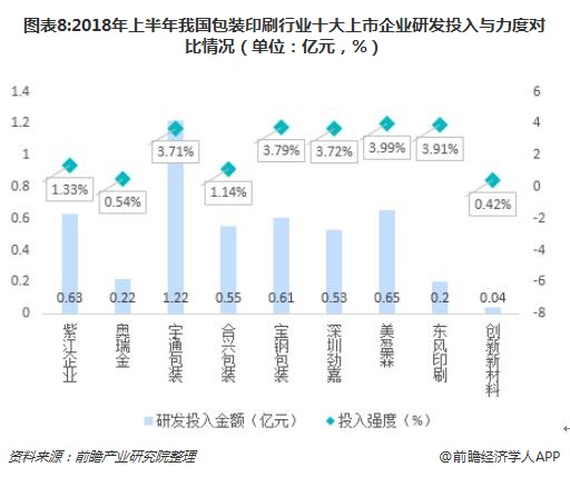 研發(fā)設(shè)計(jì)對企業(yè)的持續(xù)健康發(fā)展具有不可估量的作用,對于印刷行業(yè)來說更是一場市場的較量。2018年上半年,宇通包裝的研發(fā)投入規(guī)模最大,為1.22億元,占主營業(yè)務(wù)收入為3.71%,處于較高水平;美盈森的研發(fā)投入規(guī)模雖然只有0.65億元,但是投入力度達(dá)到最高值,為3.99%。