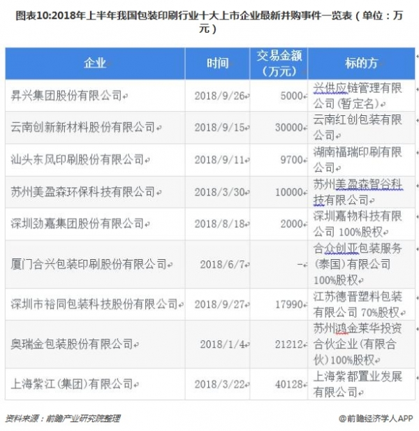 由下表的2018年上半年十大上市企業(yè)的并購事件中可知,除寶鋼包裝未出現(xiàn)并購事件,其余企業(yè)均有并購案例,說明2018年上半年包裝印刷行業(yè)企業(yè)積極采取收購兼并的手段來擴(kuò)大企業(yè)規(guī)模。