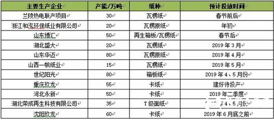 3、新增產(chǎn)能:節(jié)后瓦楞箱板紙新增產(chǎn)能較多,供應(yīng)面處于增產(chǎn)周期利空瓦楞紙上行;以下為百川資訊統(tǒng)計的將于2019年一、二季度投產(chǎn)的企業(yè):