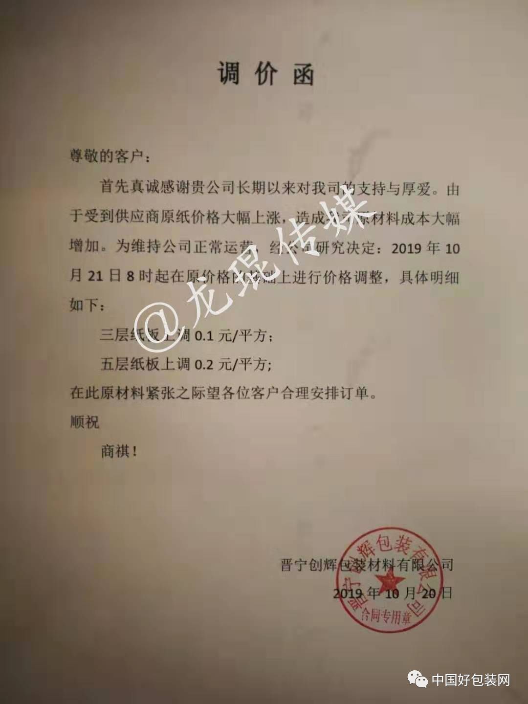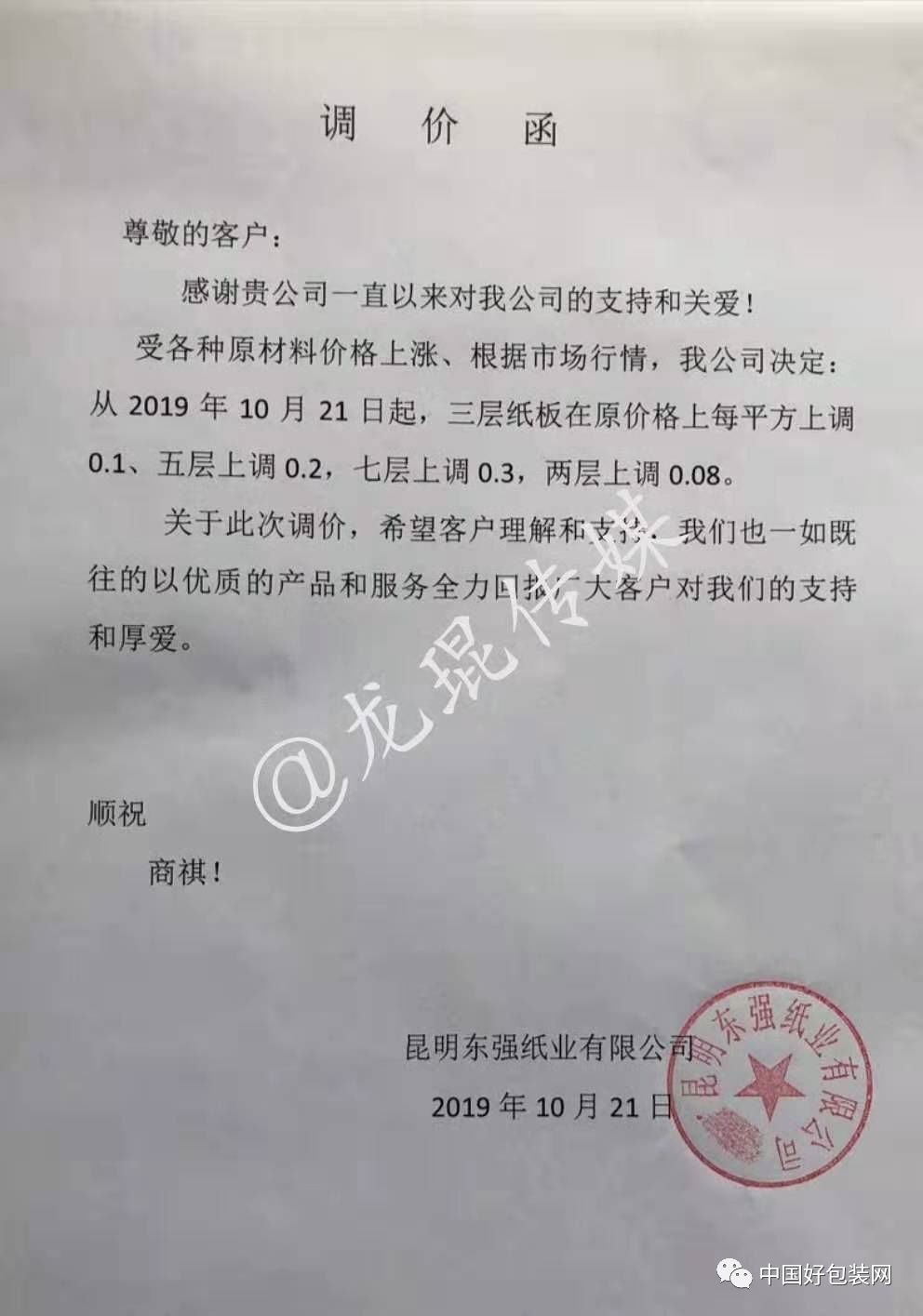 自10月21日起,三層紙板上漲0.1元/平方米,四層板、五層板上漲0.2元/平方米。