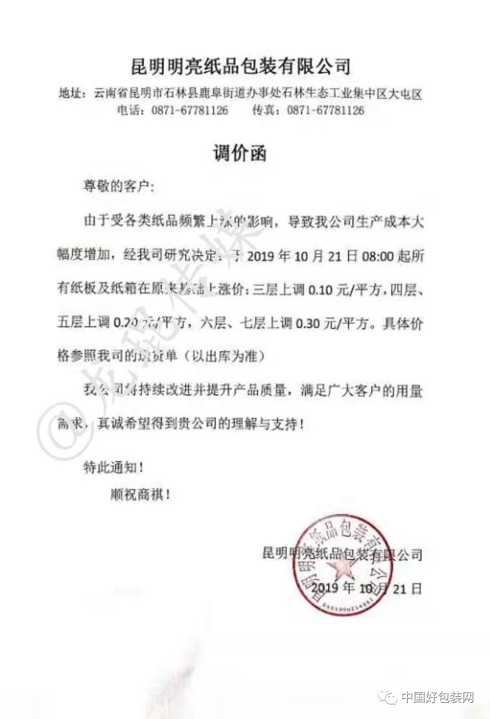 自10月21日起,所有紙板、紙箱在原單價基礎上,三層上調0.10元/平方米,四、五層上調0.20元/平方米,七層上調0.30元/平方米。