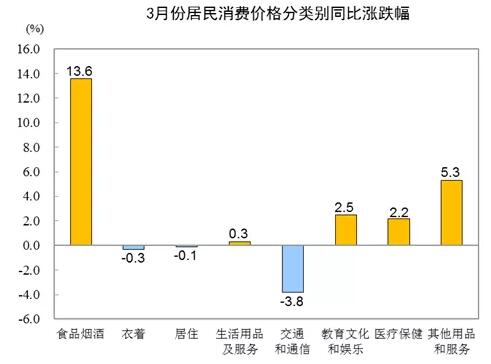 3月份,食品煙酒類價格同比上漲13.6%,影響CPI(居民消費價格指數)上漲約4.10個百分點。