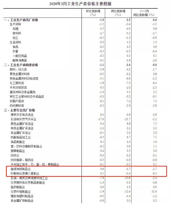 從3月工業生產者價格主要數據表中獲悉,3月主要行業出廠價格中,造紙及紙制品業環比上月上漲0.9%,同比去年下跌1.7%,一季度同比下跌2.7%。