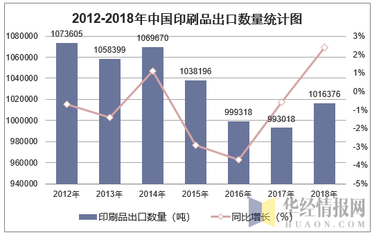 據華經產業研究院數據顯示,2018年1-12月中國印刷品出口數量為1016376噸,同比增長2.4%,出口總值約267億元,2019年2019年1—11月印刷品出口總量為964802噸,預計全年出口總值可超過280億元。
