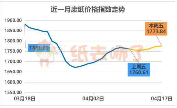 本周,廢紙價(jià)格開始小范圍上漲。截至4月17日(本周五)上午,廢紙價(jià)格指數(shù)為1773.84點(diǎn),相比上周五的1760.61點(diǎn),上漲13.23點(diǎn)。