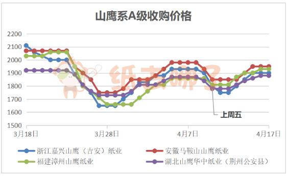 本周山鷹系A(chǔ)級(jí)廢紙收購價(jià)格總體呈上漲趨勢(shì)。截至4月17日上午,浙江上漲150元/噸、安徽上漲100元/噸、福建上漲120元/噸、湖北山鷹上漲100元/噸。山鷹系A(chǔ)級(jí)價(jià)格以安徽山鷹最高為1950元/噸;湖北山鷹最低,為1880元/噸。