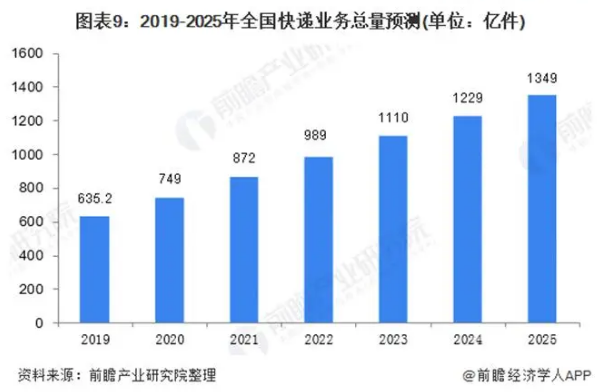 根據近幾年中國快遞業務量增速測算,到2025年,中國快遞業務量將達到1349億件,年復合增長率為13.4%。