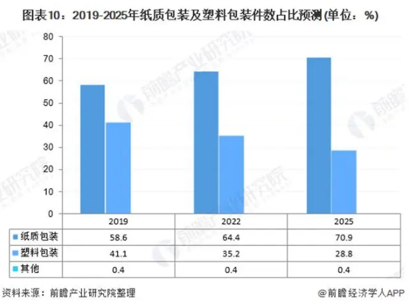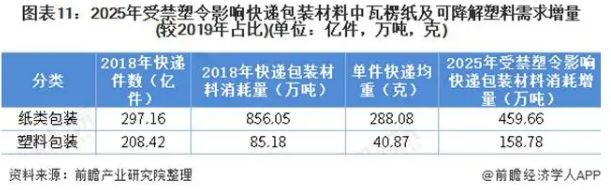 紙質包裝快遞中,瓦楞紙使用占比為96.18%,按單件紙質包裝快遞為288.08克,單件塑料包裝40.87克測算,2025年,受禁塑令影響,用于快遞包裝的瓦楞紙潛在需求增量為459.66萬噸,可降解塑料潛在需求增量為158.78萬噸。