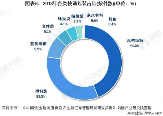 2019年,全國635.2億件快遞中,紙質包裝快遞占比約為58.6%(按2018年占比,包含瓦楞紙箱、文件袋、套裝紙箱),塑料包裝快遞占比約為41.1%(包含塑料袋、珠光袋、編織袋、泡沫材料),其它類型占比0.4%。