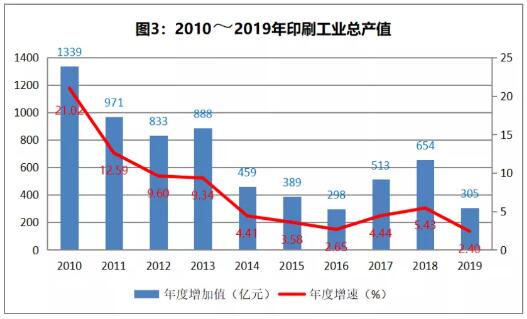近年來,我國印刷業(yè)增長速度逐年放緩,2012年增速跌破兩位數(shù),達到9.60%;隨后的2013年~2015年,增速分別為9.34%、5.30%、3.60%;到2016年增速創(chuàng)近年新低,達到2.7%;隨后觸底反彈,2017年和2018年印刷業(yè)增速分別為4.60%和5.40%。2019年,全行業(yè)的工業(yè)總產(chǎn)值增速為2.4%,只能說是低速增長,這個速度也是10年來的最低速。