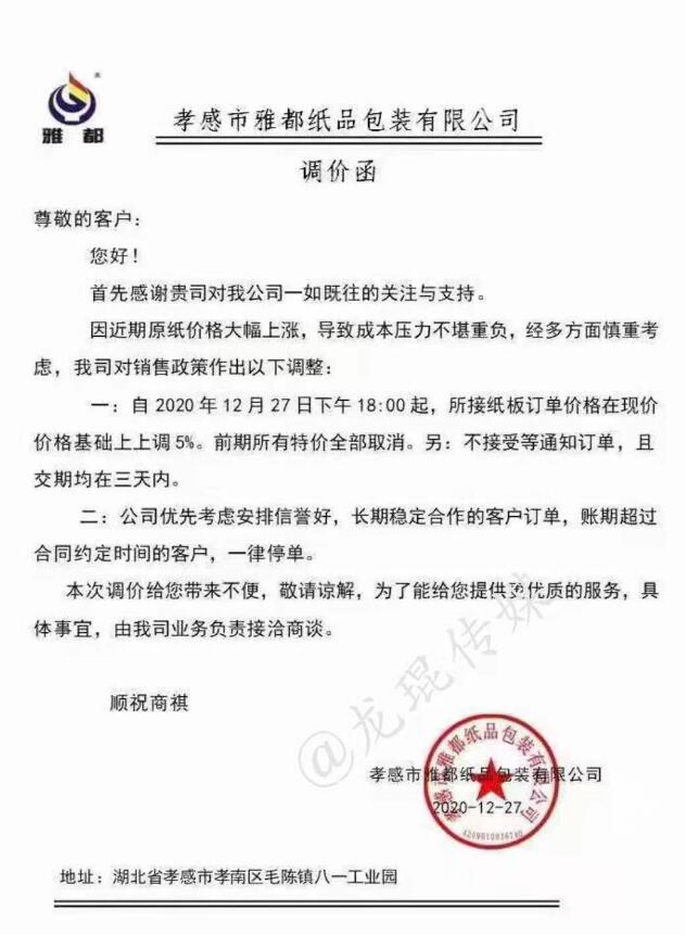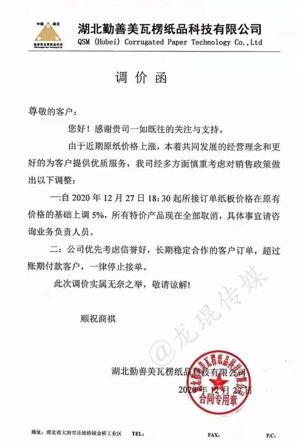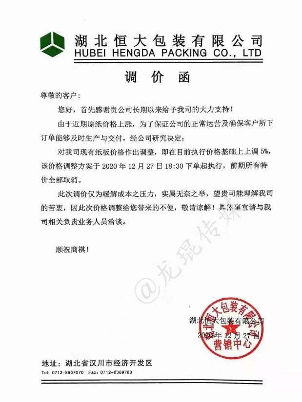 從12月27日18點(diǎn)開(kāi)始,所有紙板在原來(lái)價(jià)格基礎(chǔ)上調(diào)5%。