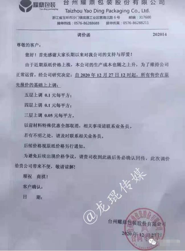 從12月27日17點(diǎn)半起,所接紙板訂單價(jià)格在現(xiàn)有價(jià)格基礎(chǔ)上上調(diào)5%,前期所有特價(jià)全部取消。
