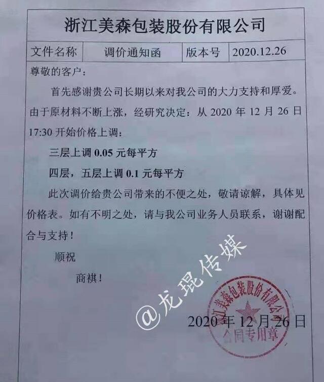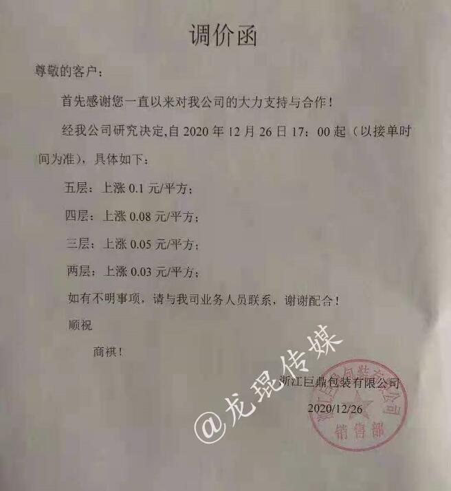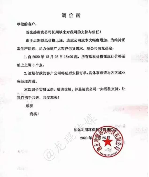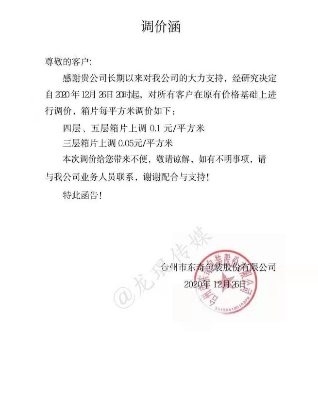 從12月27日18點(diǎn)起,所有紙板在現(xiàn)有價(jià)格基礎(chǔ)上上漲5%,前期所有特價(jià)全部取消。