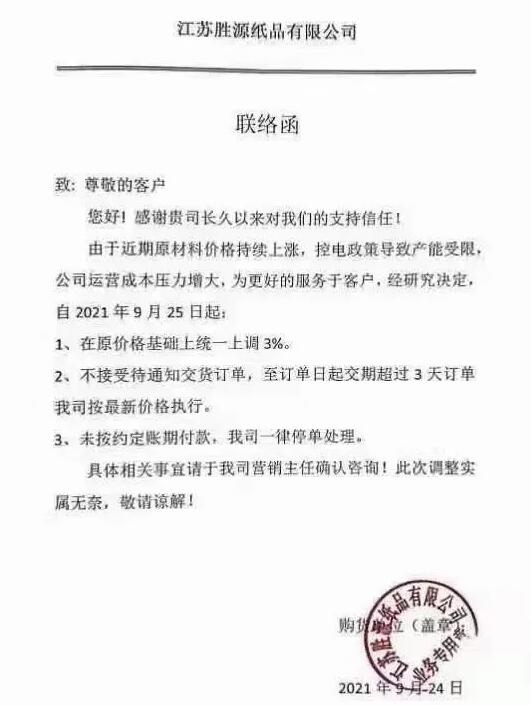 在“能耗雙控”的背景下,對造紙行業、包裝行業的影響不斷擴大,受到成本上漲與停機的影響,玖龍、山鷹及其它紙廠紛紛發布漲價函,國廢、原紙、紙板全面大面積上漲! 玖龍多個基地同時宣布今天原紙最高上調150元!其中東莞玖龍所有牛卡芯紙人民幣港幣漲100元,包括白面牛卡涂布牛卡。玖龍牌白板紙、海龍牌白板紙、地龍牌白板紙人民幣港幣漲100元,江龍牌白板紙漲150元。 沈陽基地:全系列牛皮紙、瓦楞紙在目前價格基礎上上調100元/噸。 江蘇太倉基地:全系列牛皮紙、瓦楞紙在目前價格基礎上上調100元/噸。 天津/河北基地:全系列牛皮紙、瓦楞紙在目前價格基礎上上調100元/噸。 重慶基地:全系列牛皮紙、瓦楞紙在目前價格基礎上上調100元/噸。 泉州玖龍紙業:牛卡紙、再生紙取消優惠上調50-100元/噸,瓦楞紙上調紙價100元/噸。 另一家紙業巨頭山鷹紙業宣布,從9月25日開始,所有原紙上漲50-200/噸。從10月8日開始,所有原紙再上調200元/噸。 山東德派克紙業有限公司:近期因煤炭漲價、限電減產等造成公司經營成本壓力大,公司決定自2021年9月24日起,所有紗管紙銷售價在原基礎上統一上漲100元/噸。 秦皇島金茂源紙業有限公司:由于近期原材料不斷上漲,造成生產成本大幅增加,即日起我公司紗管紙銷售價格在原有基礎上上漲100元/噸。 中冶美利云產業投資股份有限公司:受國家節能減排政策及環保政策的影響,自9月26日起,將我司旗下所有彩色紙銷售價格在當前執行價格的基礎上上調300元/噸。 廣東理文造紙:牛卡紙部分紙種價格上調50元/噸 聯盛紙業(龍海):除優質牛卡外,其它牛卡紙取消優惠,上調紙價100元/噸,聯盛紙業(龍海)高強瓦楞紙上調紙價100元/噸 東莞金洲紙業:Q紙上調50,瓦楞紙上調紙價50元/噸 東莞銀洲紙業:箱板紙上調50元/噸 四川力天紙業:瓦楞紙價格上漲50元/噸 湖北金鳳凰紙業:高強瓦楞紙上調50元/噸 浙江華川紙業:高強瓦楞紙上調50元/噸 廣東中山永發紙業:70g及以下高強瓦楞紙上調100元/噸 浙江義烏義南紙業:高強瓦楞紙上調50元/噸 河南雅都紙業:瓦楞紙價格上調50元/噸 漳州盈晟紙業:高強瓦楞紙上調50元/噸 漳州友利達紙業:瓦楞紙上調100元/噸 江門市橋裕紙業:瓦楞紙上調50元/噸 四川成都迅源紙業:瓦楞紙上調50元/噸 成都迅源紙業:箱板紙上調50元/噸 山東豐源中科:瓦楞紙上調100元/噸 河南亨利紙業:高強瓦楞紙取消優惠 吉林長白山琦祥紙業:瓦楞紙上調50元/噸 原料漲價 中下游企業無奈跟漲 騰然而起的原料成本讓9月以來貼近成本線維持生產的紙板、紙箱廠大呼受不住,“保本生產”轉眼變成虧本生產。在越來越多的原紙漲價函包圍之下,紙板廠也選擇了跟進漲價。9月24日,浙江祥恒包裝有限公司、浙江博萊特紙容器有限公司發布漲價函,紙板價格上調3%。