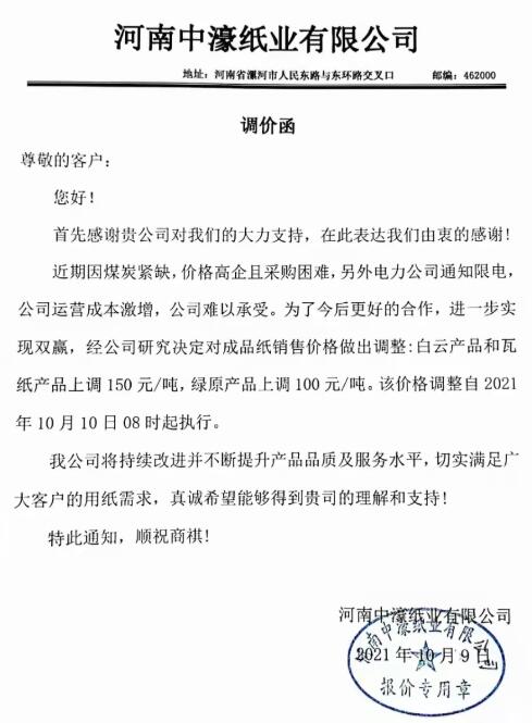 河南中濠紙業(yè)有限公司調(diào)價(jià)函稱,近期因煤炭緊缺,價(jià)格高企且采購困難,另外電力公司通知限電,公司運(yùn)營成本激增,公司難以承受。為了今后更好的合作,進(jìn)一步實(shí)現(xiàn)雙贏,經(jīng)公司研究決定對(duì)成品紙銷售價(jià)格做出調(diào)整:白云產(chǎn)品和瓦紙產(chǎn)品上調(diào)150元/噸,綠原產(chǎn)品上調(diào)100元/噸。該價(jià)格調(diào)整自2021年10月10日08時(shí)起執(zhí)行。