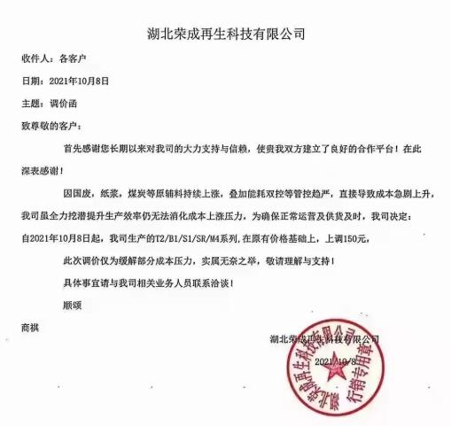節(jié)后第一個(gè)工作日(10月8日),湖北榮成再生科技有限公司發(fā)布調(diào)價(jià)函稱,因國廢,紙漿,煤炭等原輔料持續(xù)上漲,疊加能耗雙控等管控趨嚴(yán),直接導(dǎo)致成本急劇上升,公司雖全力挖潛提升生產(chǎn)效率仍無法消化成本上漲壓力,為確保正常運(yùn)營及供貨及時(shí),公司決定:自2021年10月8日起,公司生產(chǎn)的T2/B1/S1/SR/M4系列,在原有價(jià)格基礎(chǔ)上,上調(diào)150元。