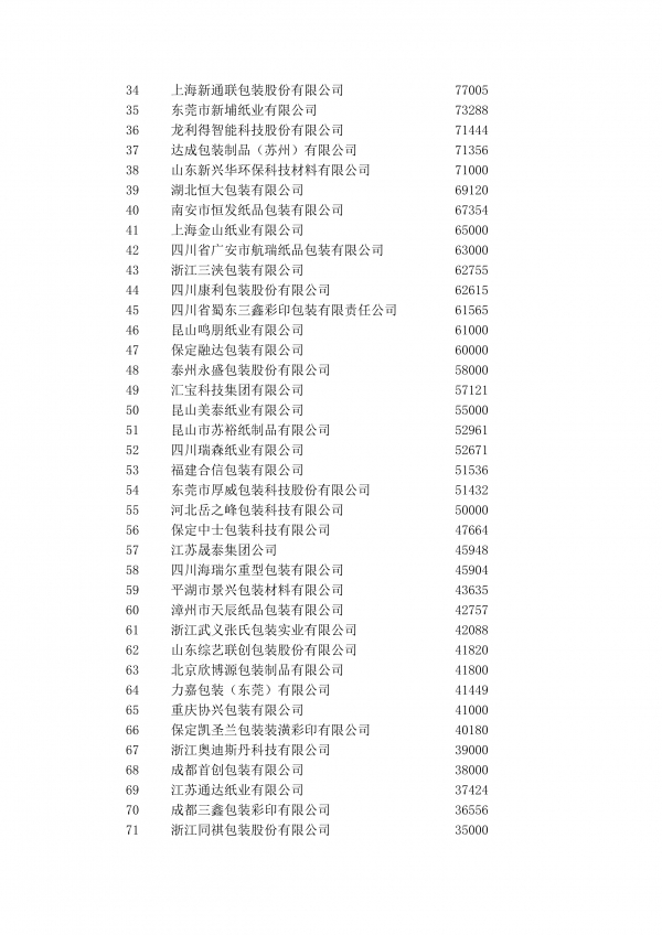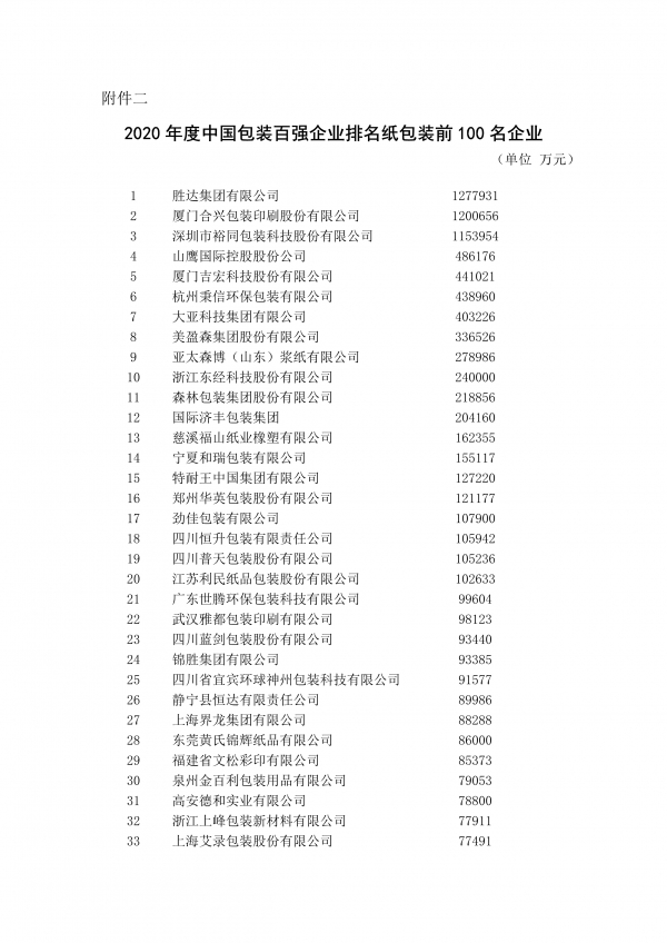 核心提示:0月21日,中國包裝聯合會官網發布了《關于2020年度中國包裝百強企業排名及行業分類排名名單的公示》。根據《關于開展包裝行業企業數據申報工作暨行業百強排名、行業分類排名活動的通知》的要求,2020年度中國包裝百強企業排名及行業分類排名活動已經結束。本次排名活動產生中國包裝百強企業、紙包裝前100名企業、包裝印刷前50名企業、金屬包裝前25名企業、塑料包裝前25名企業、包裝裝備前15名企業和木包裝前10名企業