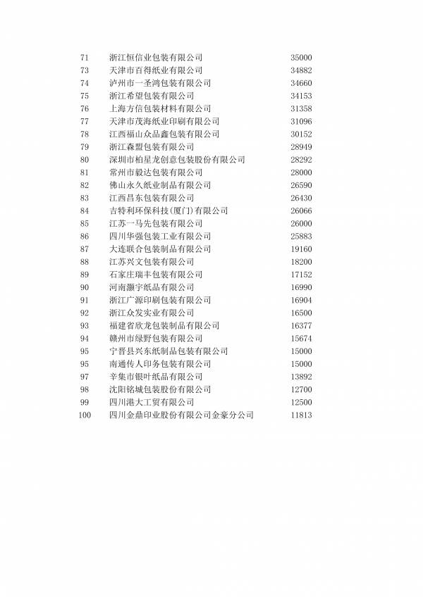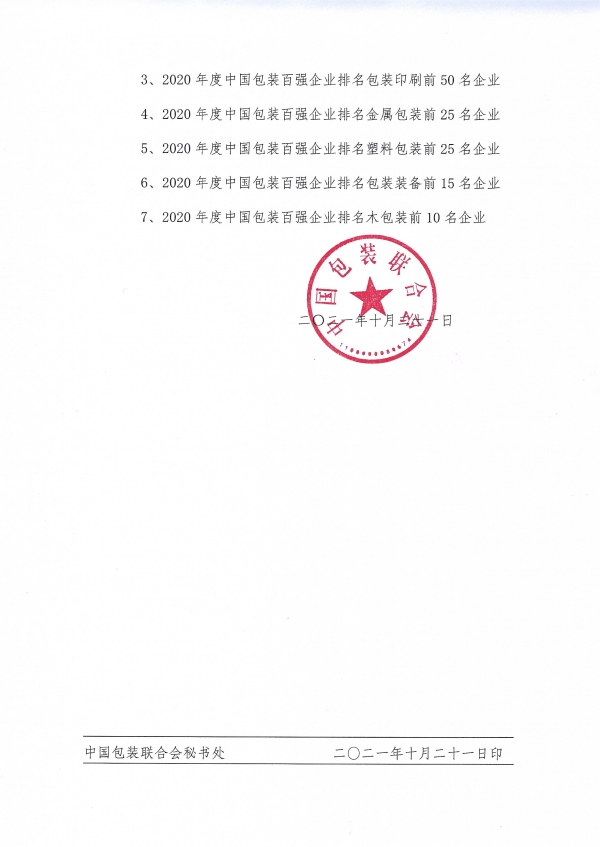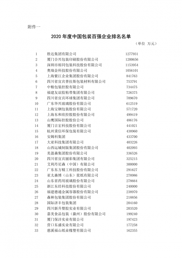 10月21日,中國包裝聯合會官網發布了《關于2020年度中國包裝百強企業排名及行業分類排名名單的公示》。根據《關于開展包裝行業企業數據申報工作暨行業百強排名、行業分類排名活動的通知》的要求,2020年度中國包裝百強企業排名及行業分類排名活動已經結束。本次排名活動產生中國包裝百強企業、紙包裝前100名企業、包裝印刷前50名企業、金屬包裝前25名企業、塑料包裝前25名企業、包裝裝備前15名企業和木包裝前10名企業。以下為具體內容: