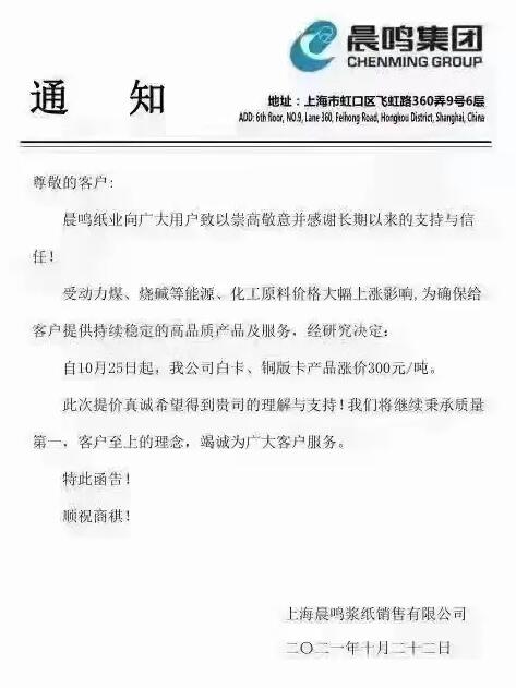 11月工業(yè)原紙走勢如何?想必是大家很關(guān)心的話題了,但至少在白卡紙行業(yè),漲價已成定局。10月22日,晨鳴、APP兩家居于壟斷地位的白卡供貨商宣布從11月1日開始,每噸白卡漲價300元/噸。