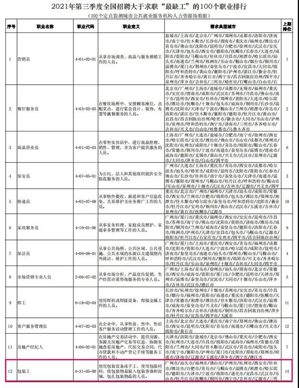 值得關注的是,一季度包裝工排名進前十,盡管三季度包裝工并未進入前十,但排名依舊靠前,居于第十二位,較上期第十四位又有所上升,可見包裝工的市場缺口仍然比較大。