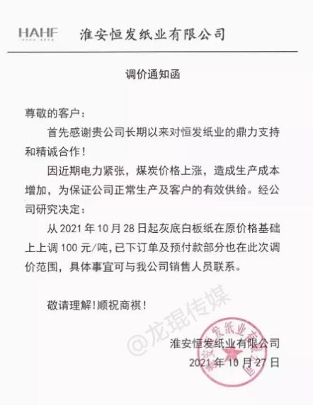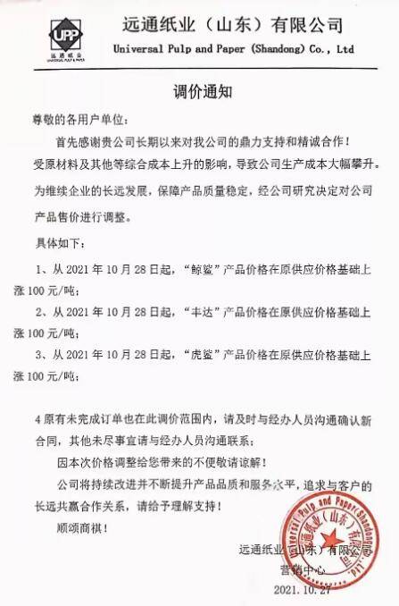 為確保產(chǎn)品品質(zhì)的穩(wěn)定性及供貨及時(shí)性,經(jīng)公司研究決定:自2021年11月1日起,銀杉上調(diào)150元/噸,紫杉、紅杉、T紙、高瓦、金桂、四季桂上調(diào)100元/噸。