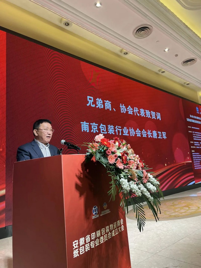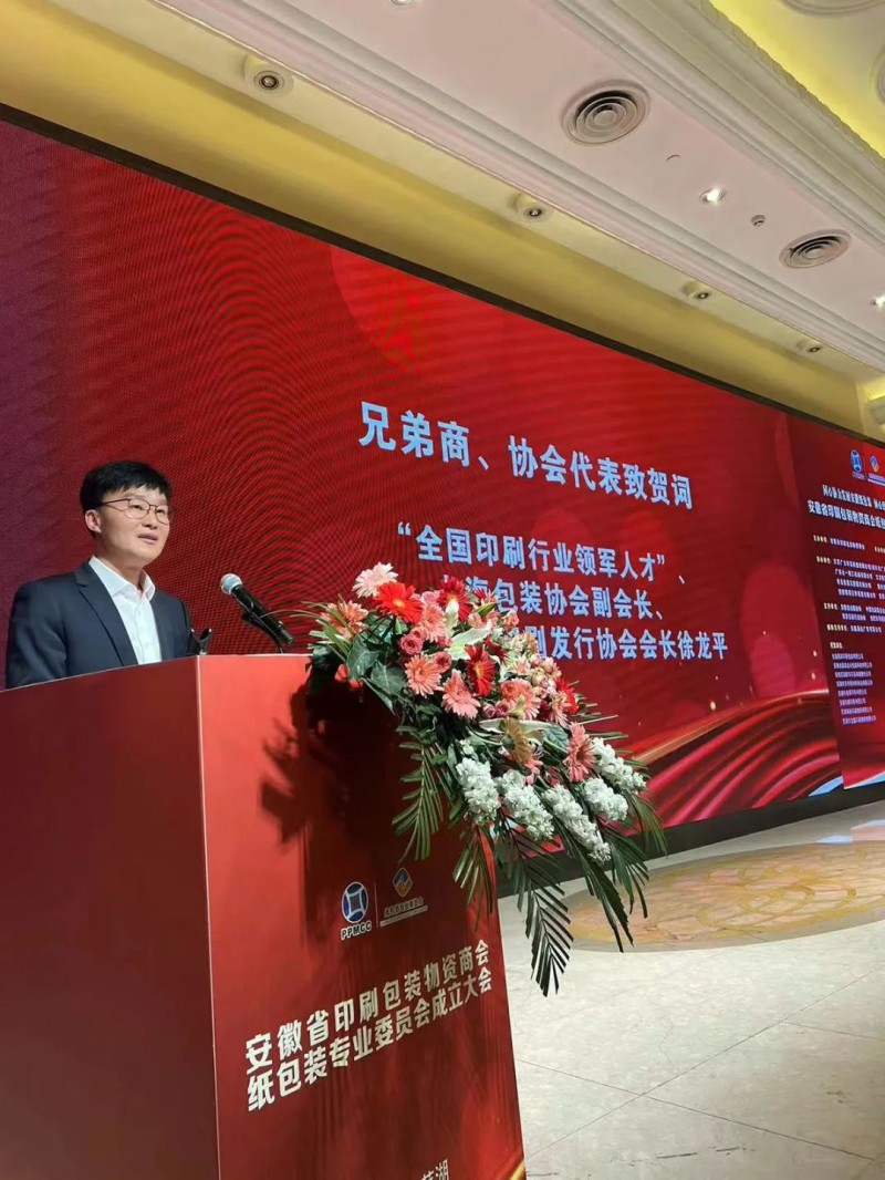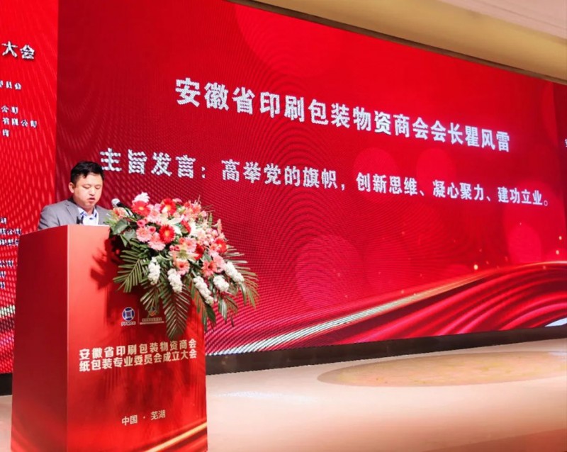 安徽省印刷包裝物資商會秘書長徐敏宣讀了《安徽省印刷包裝物資商會關(guān)于設(shè)立紙包裝專業(yè)委員會的決定》,瞿風(fēng)雷作了題為《高舉黨的旗幟,創(chuàng)新思維、凝心聚力、建功立業(yè)》的主旨發(fā)言,李新江作了題為《讓時(shí)光為我們喝彩》的致辭。徐龍平代表上海市包裝技術(shù)協(xié)會、上海市奉賢區(qū)印刷協(xié)會、滁州市出版印刷發(fā)行協(xié)會,唐衛(wèi)軍代表南京市包裝行業(yè)協(xié)會,吳琴智代表合肥市印刷協(xié)會,先后向大會敬致了熱情洋溢的賀詞。廣東臺一精工機(jī)械有限公司等 10 家支持單位,發(fā)布了最新產(chǎn)業(yè)信息。唐永亮代表中國包裝聯(lián)合會紙制品包裝專業(yè)委員會,在大會上發(fā)表了講話,他對中國紙包裝發(fā)展形勢作了準(zhǔn)確的分析判斷,對中包聯(lián)紙制品包裝專委會與安徽省印刷裝物資商會紙包裝專委會的合作提出了殷切期望。